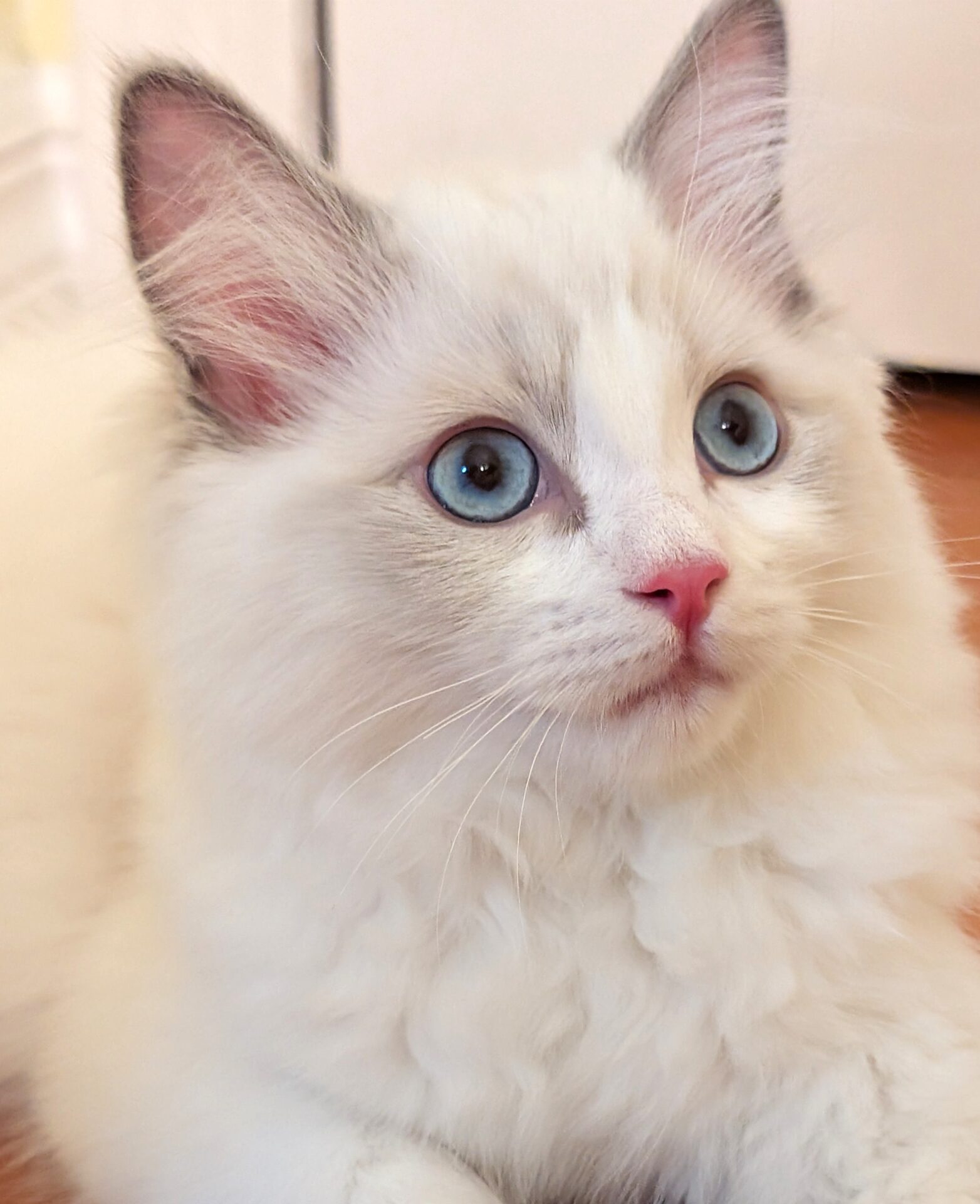 King is a handsome Blue Bicolor cat. With his gentle and adorable personality, his fur is as soft as a bunny’s, and his deep blue, gem-like eyes can instantly melt the heart of anyone who meets him. King is both calm and energetic, always following us around and keeping us company. He thoroughly enjoys being groomed and cuddled, often purring happily to show his affection. King originally came to us from a TICA-registered cattery in New York.